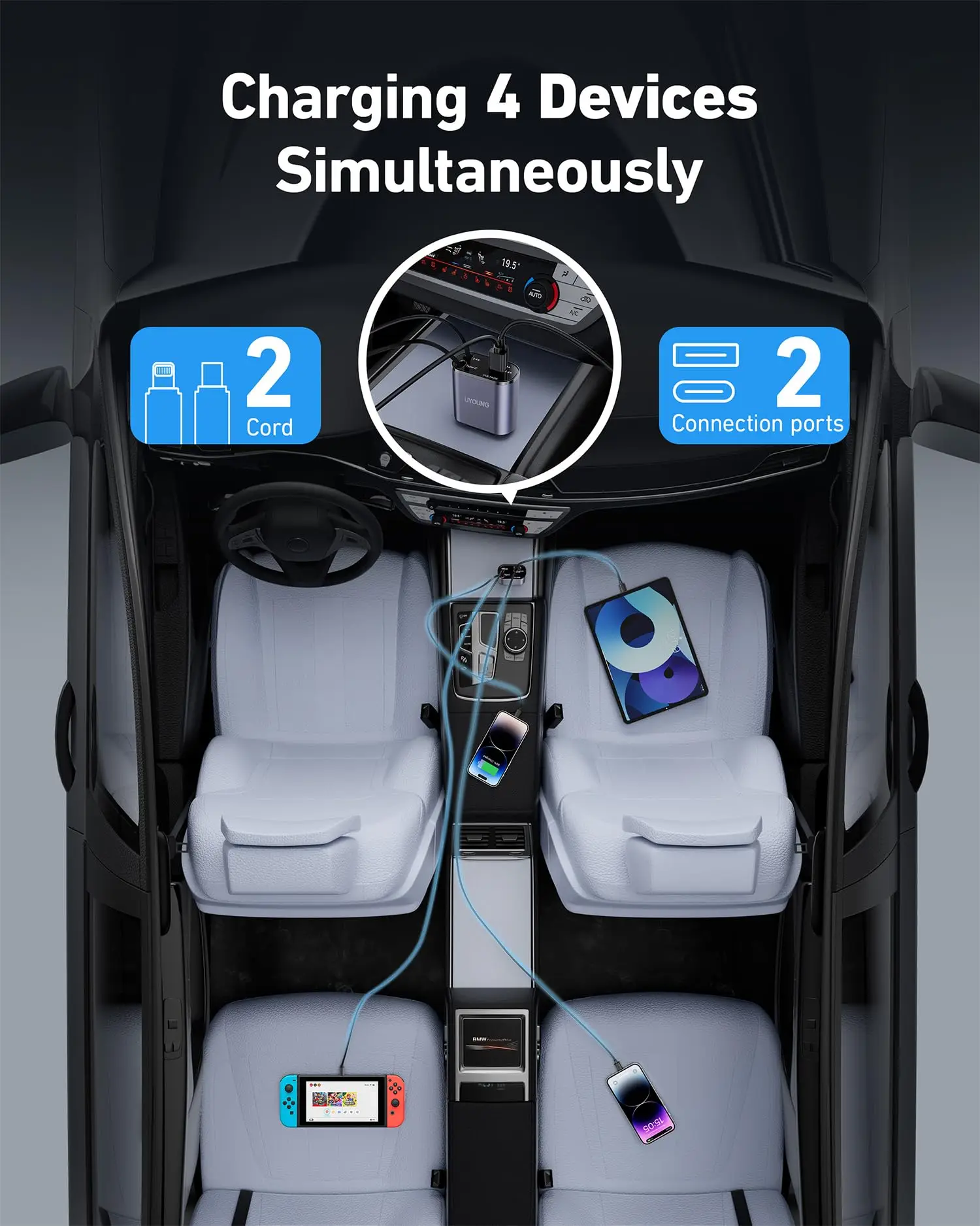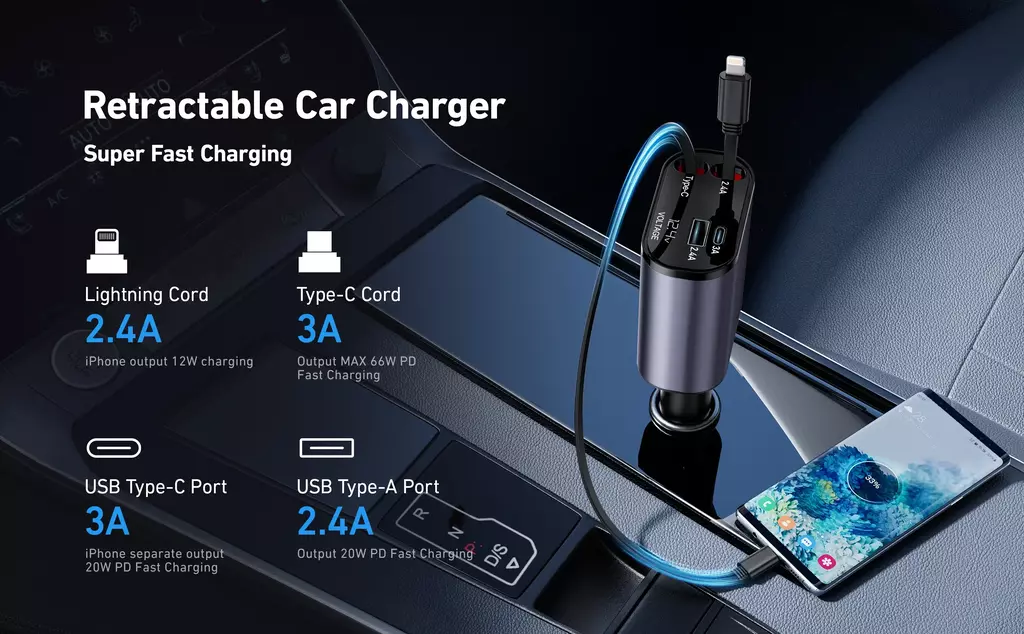Descrição do produto:O carregador de carro retrátil 4 EM 1 de 120 W/66 W foi projetado para fornecer carregamento rápido, eficiente e conveniente em qualquer lugar.Este carregador versátil possui um cabo retrátil, carregamento USB PD de alta velocidade e um adaptador de controle de qualidade para uso na tomada do isqueiro do seu carro.Oferece compatibilidade superior com iPhone, Tipo C e outros dispositivos móveis e garante carregamento rápido e seguro com mecanismos de proteção integrados.Esteja você viajando ou viajando diariamente, este carregador é o companheiro ideal para manter todos os seus dispositivos ligados.
